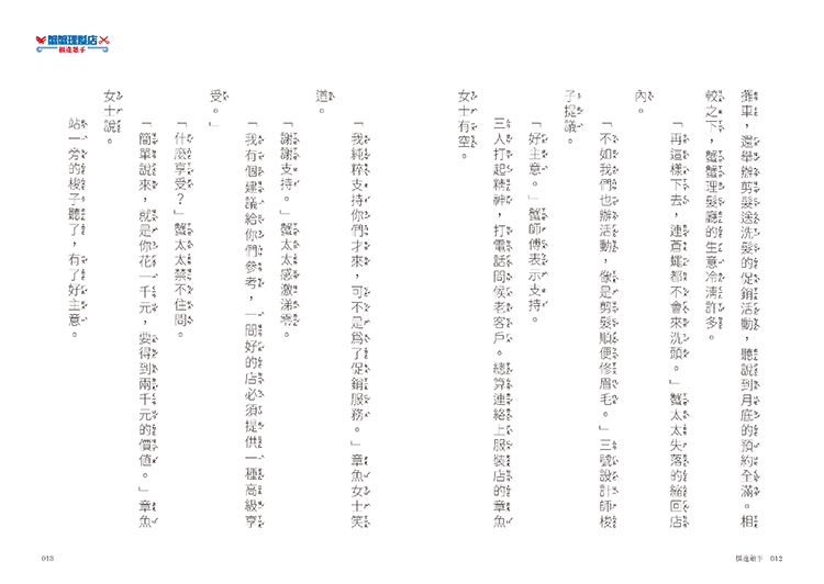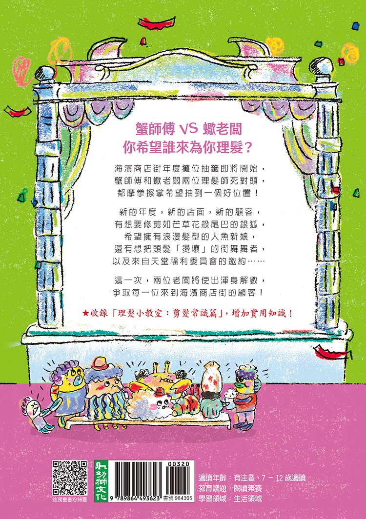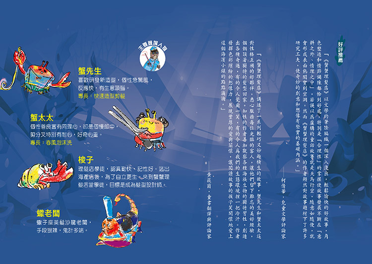 「《蟹蟹理髮店》以文學的筆法編織一個深入淺出,輕鬆愉快的好故事,角色塑造和情節鋪陳都恰到好處,特別是「合理性」的掌握使故事發展不斷在「意料之外、情理之中」。若誤以為虛構的童話故事就是天馬行空,隨意如隨便,就會形成表面熱鬧實則空洞。然而《蟹蟹理髮店》的作者顯然對故事題材下了許多研究工夫,使奇妙的創意和想像有堅實的基礎內涵。」──柯倩華|兒童文學評論家