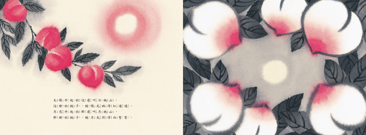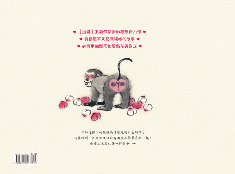 這種「我們」與「他們」的題材並不算新穎,例如《黑白村莊》和《白國王與黑國王》,都歸屬於這一類主題。但劉如桂以辟邪物「日月仙桃牌」為靈感,日與月不只相對,也悄悄為故事的後續埋下了有趣的伏筆。加上水墨暈染的畫風,充滿古意,頗有古老傳說的風情。此外,不同於前述兩書中有外在事件/人物做為產生交集的介入,《哈!是粉紅色的》以兩方猴子在爭執過程中自然生成的結果為媒介,再揉合混色的概念,玩出不同的轉折。可愛又有點ㄎ一ㄤ的故事讓人讀得嘴角上揚,也讓人好想來一顆甜甜的紅桃或是香香的白桃啊。