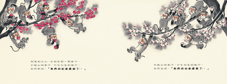 這是一個講述兩群猴子因桃子的顏色而吵架的故事。書中的水墨技法極具藝術性,加上質樸簡單有趣的故事,讓孩子們領悟到分享與尊重的重要性,適合各年齡讀者共讀。